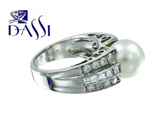 Elegante anello a fascia in oro bianco 18kt costituito da 3 file di diamanti con al centro una perla bianca misura 10. La fila centrale è costituita da 10 diamanti taglio carré mentre la fila superiore e inferiore sono costituite ciascuna da 8 diamanti taglio brillante colore G VSI1 per un totale di 1.20 kt Peso 8.60 gr L’anello può essere messo a misura dalla 11 alla 15. In fase di check-out indicare nelle note la misura desiderata