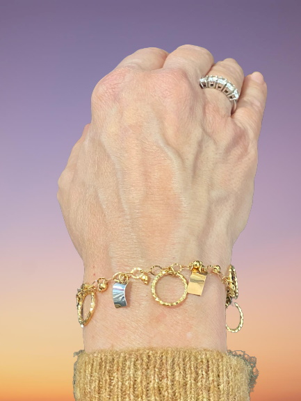 Elegante bracciale in oro tricolore 18kt massiccio, composto da una catena a maglie piatte di forma ovale diamantata a cui sono appesi 6 cerchi in oro giallo inciso e diamantato (1.4 cm di diametro), 3 lastre  in oro bianco lucido, 3 lastre in oro rosè lucido e 10 piccole sfere in oro giallo diamantato. Chiusura a moschettone. Lungo 18,5 cm. Peso 6.50 gr