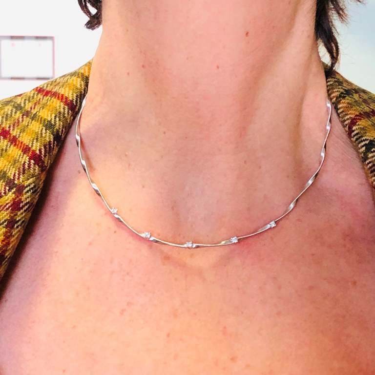 Girocollo in oro bianco 18kt Giorgio Visconti con ciondolo rotondo conpavè di 17 diamanti incassati a grif ed un diamante tra l’ anello passante ed il ciondoloper una caratura totale di 0,63kt Colore IFG. Catena rolo’ lunga 42 cm. Chiusura a moschettone. Peso 4.30 gr
