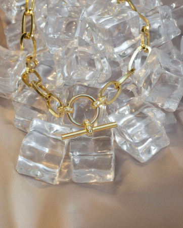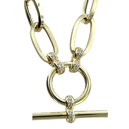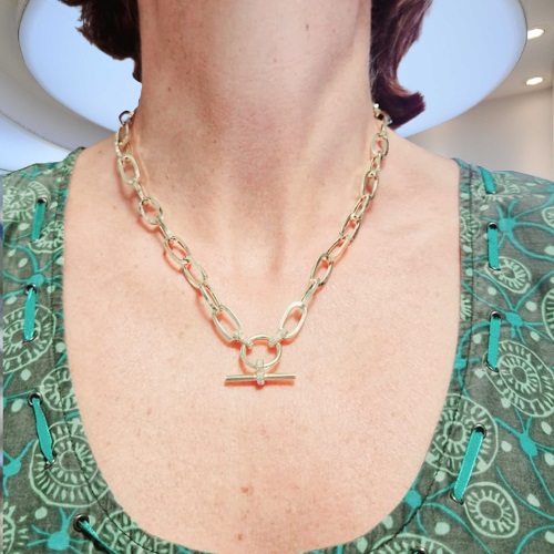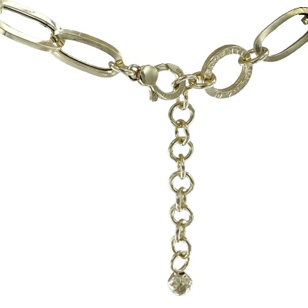 Elegante girocollo Riflessi di luce di  Opera Argenti in argento 925 in bagno d’oro di 2 µ di spessore composto da una catena a maglie ovali larghe 8 mm e al suo centro un ciondolo rotondo tenuto da due fasce con zirconi incassati e nella parte inferiore una seconda fascia in argento con zirconi che sostiene una barretta. Lunghezza girocollo regolabile da 44 a 48 cm Chiusura a moschettone Peso argento 17.3 gr