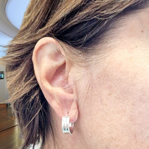 Orecchini a cerchio in oro bianco 18 kt a fascia spessa 6 mm diamantata sui bordi Diametro esterno orecchini 1.6 cm Chiusura a baionetta Peso oro 2.8 gr