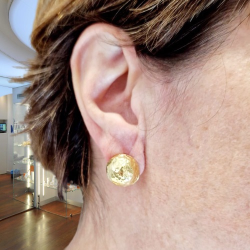 Eleganti orecchini a lobo Opera Argenti in argento 925 dorato composti da una mezza sfera con la superficie martellata. Diametro sfera 1.6 cm Peso argento 5.6 gr Chiusura a perno con farfallina