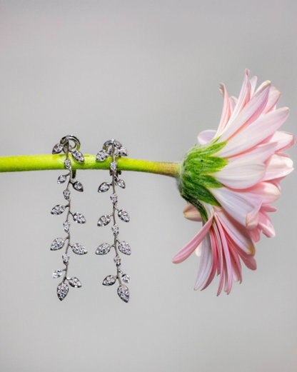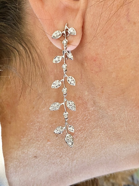 ORECCHINI PENDENTI IN ORO BIANCO 18KT FINAMENTE LAVORATI IN FOGGIA DI RAMO CON 13 FOGLIE CISCUNO CON INCASSATI DIAMANTI PER TOTALE CARATI 0,94 COLORE G VSI1. CHIUSURA AD ABBRACCIO PESO 12.80 GR LUNGHEZZA 6.00 CM