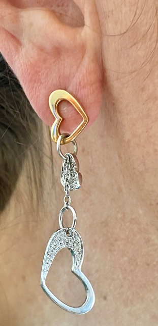 ORECCHINI PENDENTI IN ORO BIANCO E GIALLO 18KT CON DIAMANTI COMPOSTI CIASCUNO DA UN CUORE IN ORO GIALLO A LOBO A CUI E’ APPESO UN PICCOLO CUORE CON PAVE’ DI DIAMANTI ED UNA CATENELLA ROLO’ CHE TERMINA CON UN  CUORE VUOTO CON UN LATO IN ORO BIANCO LUCIDO E L’ALTRO CON PAVE’ DI DIAMANTI. CARATURA TOTALE 0.48KT COLORE G VSI1. LUNGHI 5,00 CM PESO 7.80 GR