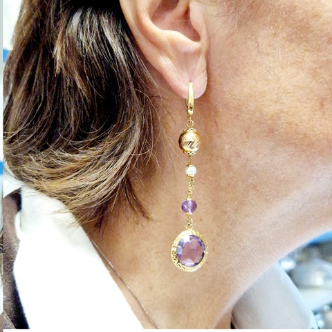 Orecchini pendenti in oro giallo 18 kt con perle e ametiste viola