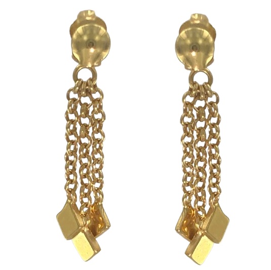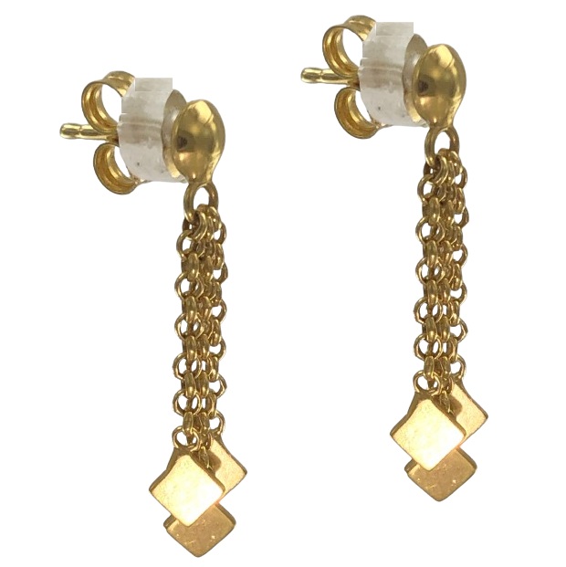 Eleganti orecchini pendenti in oro giallo 18kt composti ciascuno da una mezza sfera di 5 mm a lobo a cui sono attaccate 3 catenine rolò con all’estremo 4 rombi in lamina lucida. Lunghezza orecchini 2.5 cm Peso oro 2.6 Chiusura a perno con farfallina