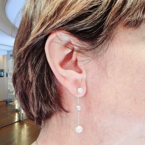 Orecchini Yukiko a pendenti in oro bianco 18kt con 2 perle misura 5/5,5, due perle  6,5/7 e due perle in oro diamantato. Le perle sono legate da una catenella rolo’ diamantata bianca Peso 2.60 gr. Lunghi 4.50 cm