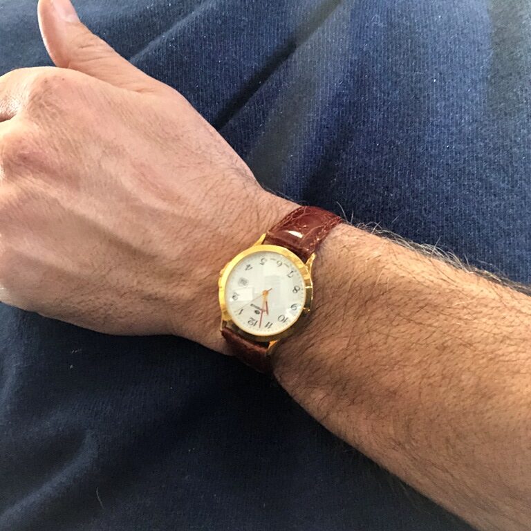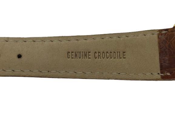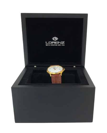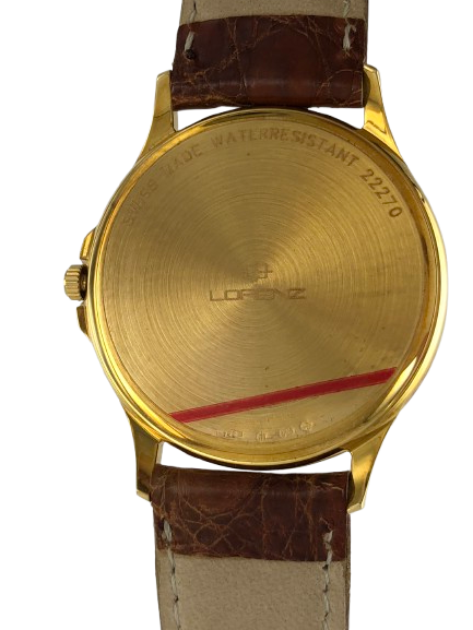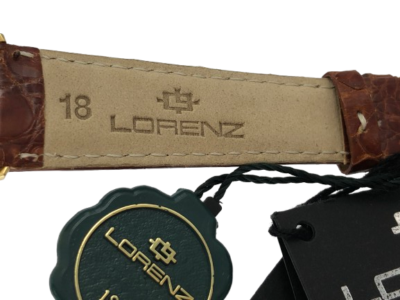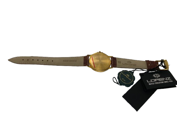 Orologio Lorenz in oro 18kt cassa rotonda con diametro di 3.4 cm spessa 0,7 cm  fondo bianco, numeri arabi e datario water resistent 3 atm movimento al quarzo Swiss Made cinturino in pelle coccodrillo color marrone lungo 21 cm Viene venduto in un cofanetto in legno della Lorenz